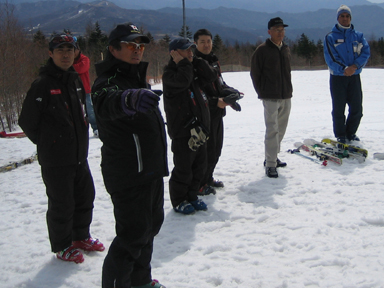 pm1:30午後の講習開始です。午後は「親御さんが一緒にいると子供が甘えてしまう。」との椿原会長からのお言葉で親御さん方は椿原会長と一緒に滑っていただきました。(1人の親御さんは初めてだったので子供達と一緒に滑りました。)ほとんどの子供達は徐々に感じを掴みだして一転び毎に滑走距離が長くなっていきます。ところが私が受け持った男の子はプルークスタンスが保てません。直ぐに脚が閉じてきてしまいます。しばらく手でスキーのトップが開かないように押さえて滑ります。しかしスキーのテールが開けないので制動がかかりません。「う〜ん。これは手強いぞ。」何とか下まで滑り降ろすことができました。リフトの乗り方と降り方を説明してリフトへ向かいます。リフトには無事に乗れました、そして心配の降り場に到着します。「頭を前に出してぇ〜。」おぉ、誰も転ばずに降りることができました。すばらしい、ちょっと感動。最終的にリフトに4,5本乗ったでしょうか。本当に子供達の上達の早さには驚かされます。その上達の早さは感動ものです。指導者冥利に尽きるといったところでしょうか。有資格者になって間もなくの頃、初心者の方を受け持ったことやそのときの感動を思い出しました・・・・・昨年は。今年の男の子は本当に手強かった。パラレルで直滑降はできたし、「スキーって簡単だね。」なんていっていたので「実はこういう子がスキーが上手くなるのかも。」などと一瞬思いながら「滑ることはできても止まれなかったら危ないだろ!」と言い聞かせてプルークを教えていましたが、違うアプローチをしたらパラレルターンができたかも???。今年は教えることの難しさを実感しました。